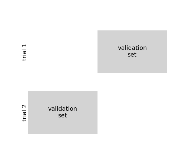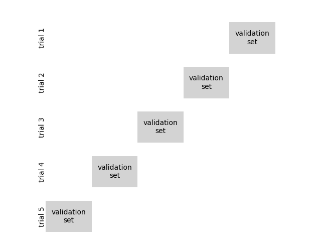 We could expand on this idea to use even more trials, and more folds in the data—for example, here is a visual depiction of five-fold cross-validation: