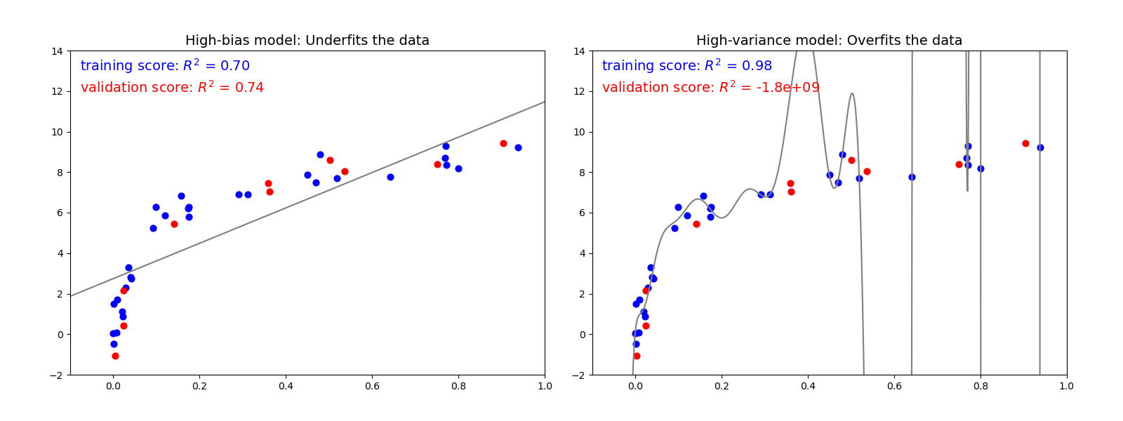 The model on the left attempts to find a straight-line fit through the data. Because the data are intrinsically more complicated than a straight line, the straight-line model will never be able to describe this dataset well. Such a model is said to underfit the data: that is, it does not have enough model flexibility to suitably account for all the features in the data; another way of saying this is that the model has high bias.