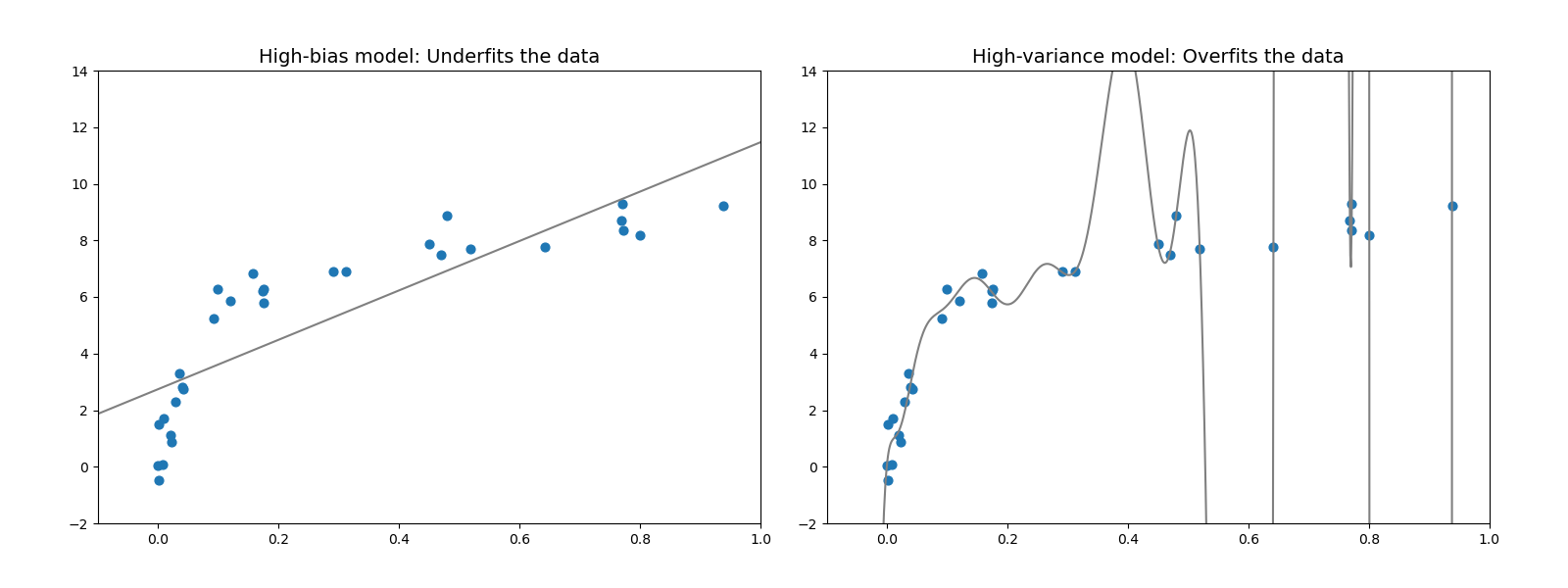 Fundamentally, the question of "the best model" is about finding a sweet spot in the tradeoff between bias and variance. Consider the following figure, which presents two regression fits to the same dataset: