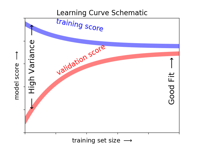 The only way to increase the converged score is to use a different (usually more complicated) model. We see this in the right panel: by moving to a much more complicated model, we increase the score of convergence (indicated by the dashed line), but at the expense of higher model variance (indicated by the difference between the training and validation scores). If we were to add even more data points, the learning curve for the more complicated model would eventually converge.