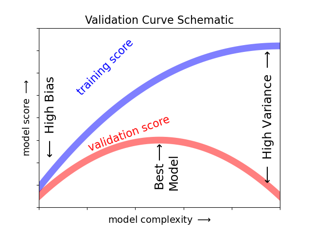 - For some intermediate value, the validation curve has a maximum. This level of complexity indicates a suitable trade-off between bias and variance.